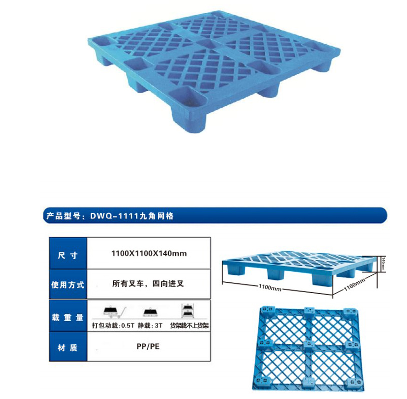 2、九腳塑料托盤產(chǎn)品選用高分子量高密度聚乙烯樹脂,經(jīng)擠出一次吹塑成型。成型過程快速、充分;產(chǎn)品成型飽滿,內(nèi)在質(zhì)量和性能穩(wěn)定。